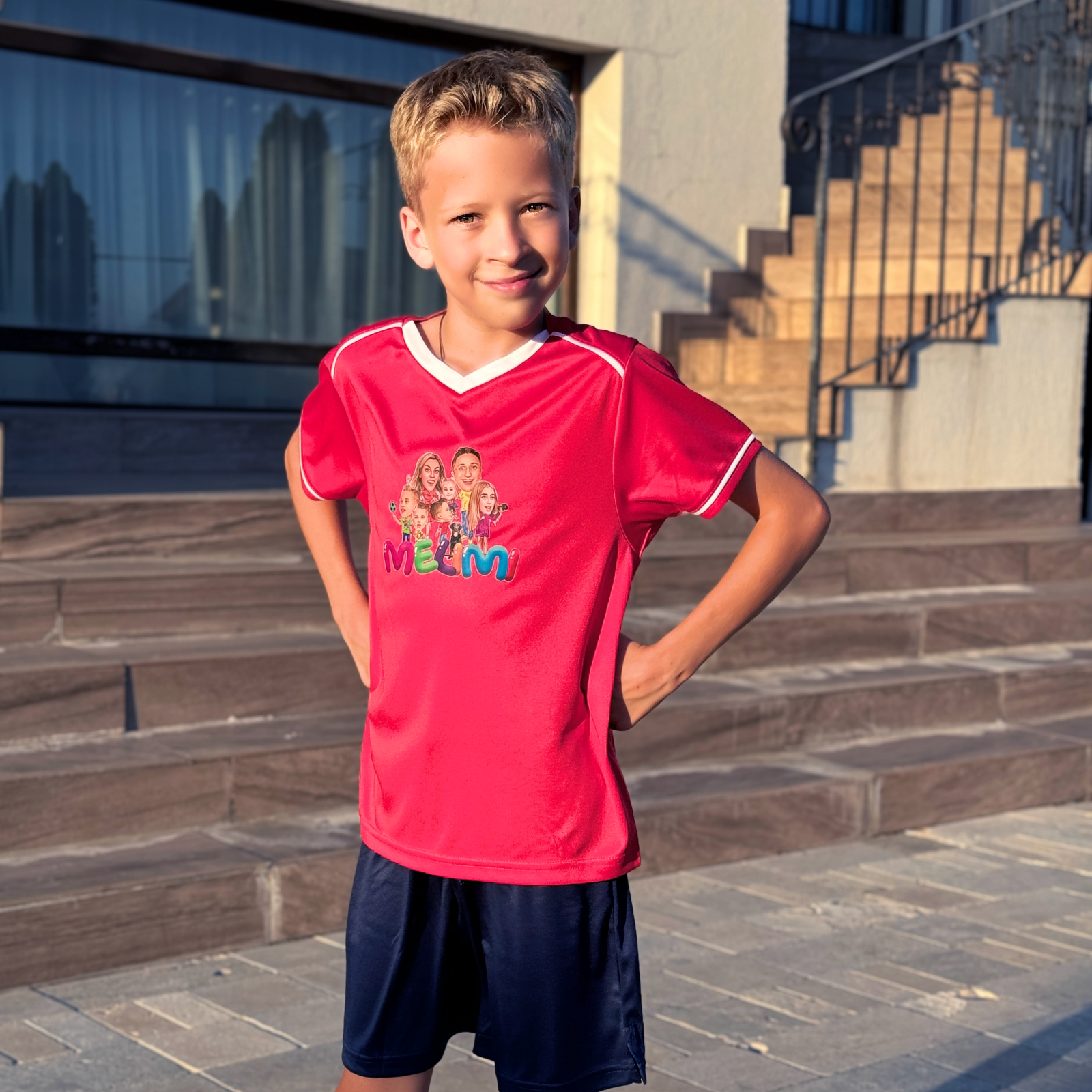 Set sport pentru copii, tricou și pantaloni scurți din 100% poliester, 140 g/m², material respirabil. Talie elastică cu cordon, croială lejeră, perfect pentru sport și joacă.
