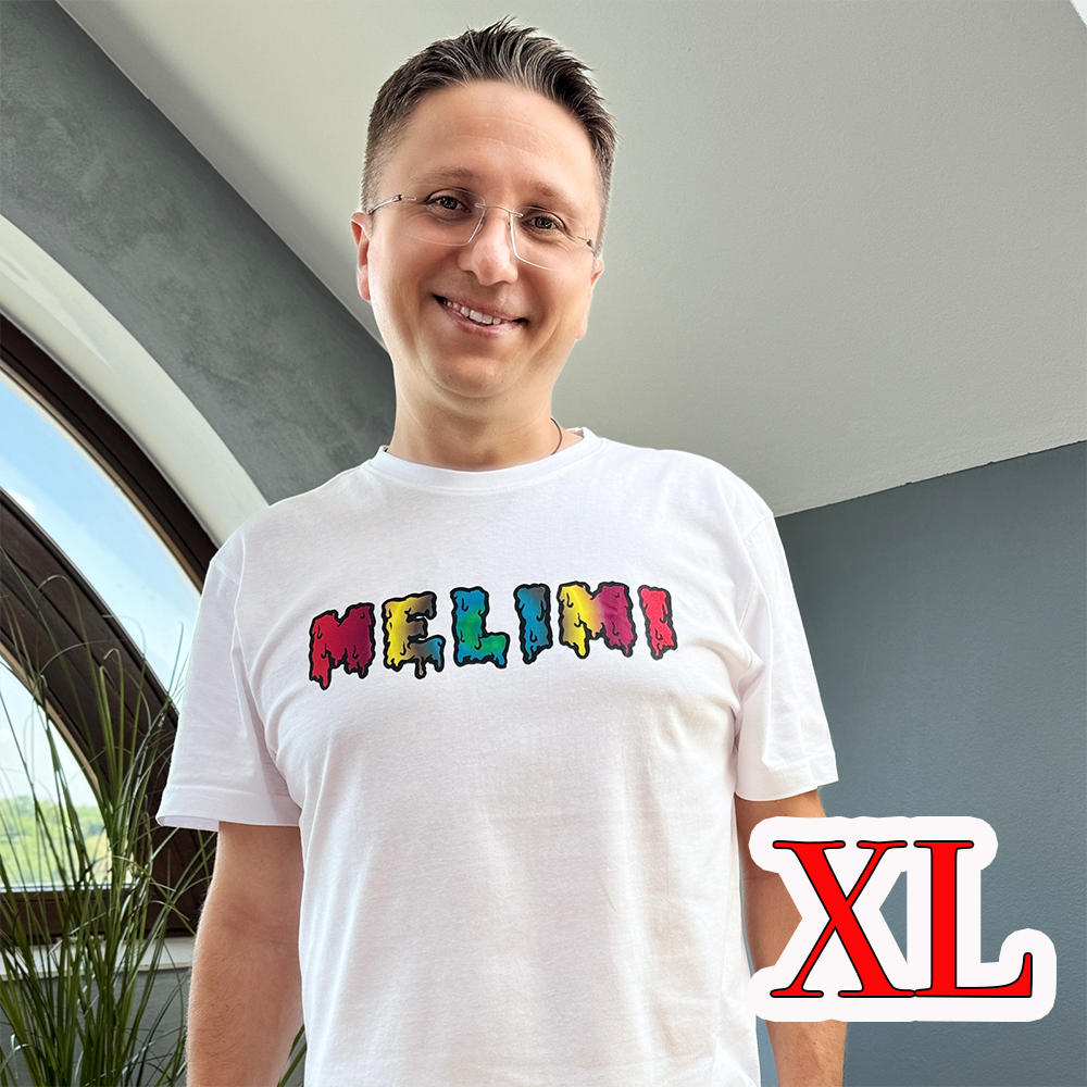 Tricou MELIMI pentru adulți, disponibil în croială de bărbați, de femei și unisex. 100% bumbac, confortabil, cu imprimeu cu text MELIMI pe față.